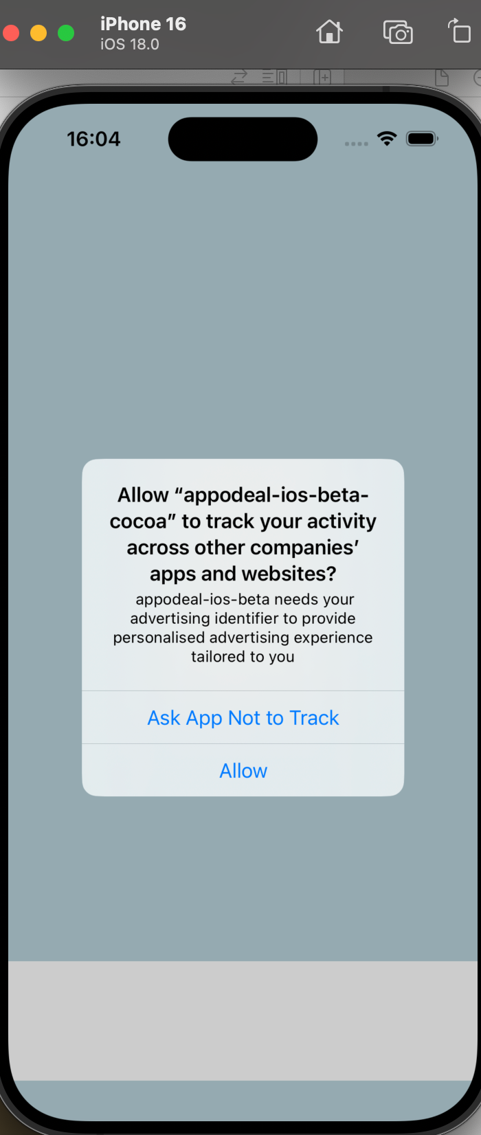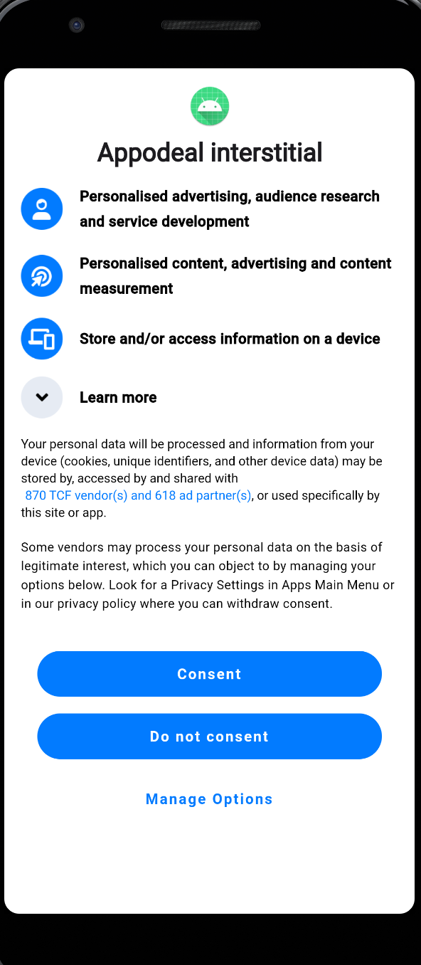 - 2.2 Consent Manager window and ATT(only for iOS) are visible on the screen right after Appodeal initialization and you don't see any related errors in logs: