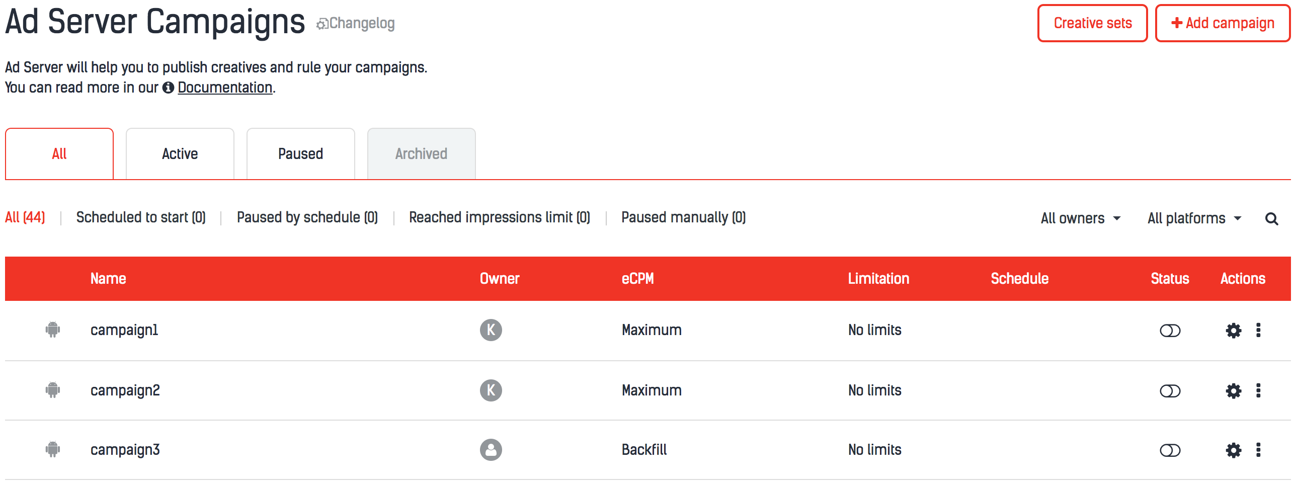To see and manage creative sets you already have (or to create a new one), click on the "Creative Sets" button. Other elements on this page are directly related to your campaigns. Columns "Name", "Owner" and "eCPM" show you exactly what they mean. "Limitation" column shows any frequency capping limitations in the campaign. "Schedule" column shows start/end dates if they exist. With the button in the "Status" column, you are able to turn on/off your campaign.