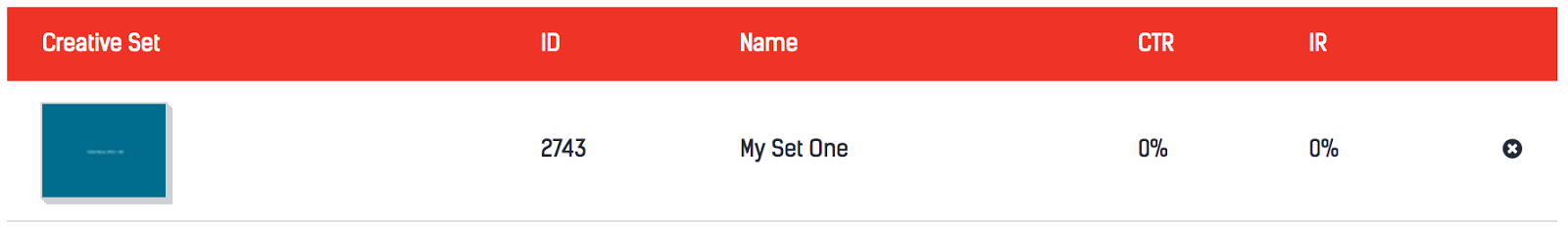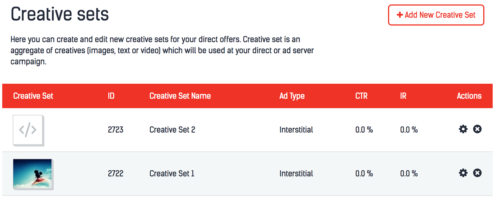 To edit any creative set, click on the creative thumbnail or gear icon button in the "Actions" column or delete any set you want by clicking on the cross icon button. Also, please know that it's not possible to delete a creative set that is already being used in one of the campaigns.