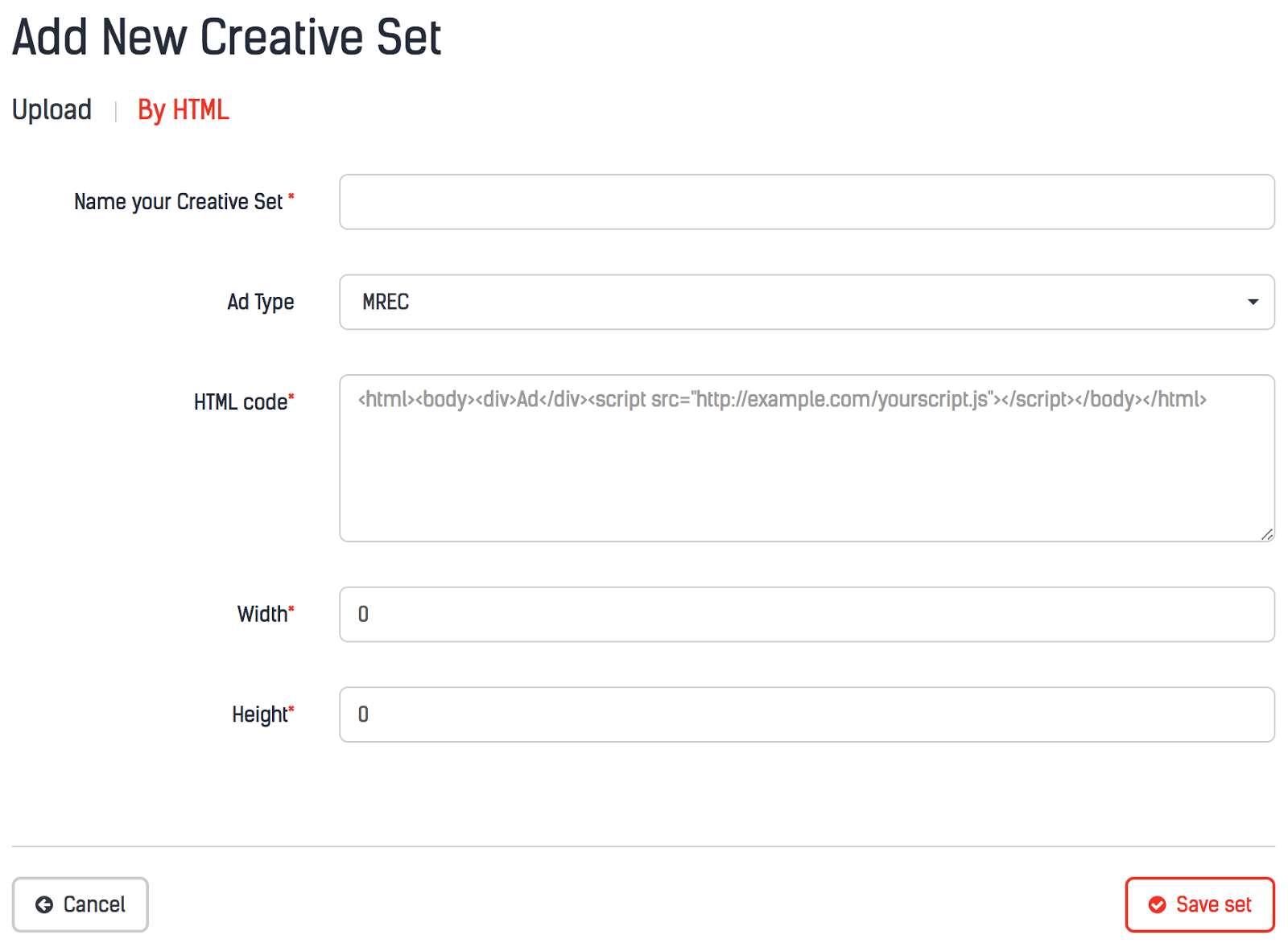 As in the cases of banners and interstitials, you can use your custom HTML code as MREC creative (but without macros, “Base URL” or “Loading Script” options):