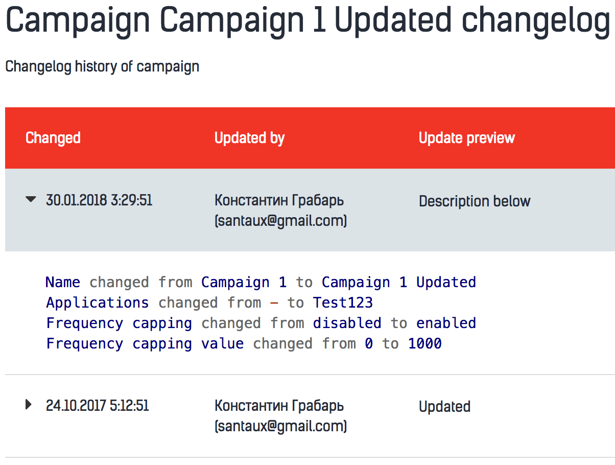 The gear icon in the "Actions" section allows you to edit a created campaign, and the white cross icon allows you to completely delete the campaign. Also, you can see campaign statistics for a week after by clicking on the "Statistics" button in the menu or copy the campaign by clicking on the "Copy campaign button". Finally, there is an option to see all campaign changes that have been made over a whole period: