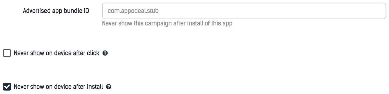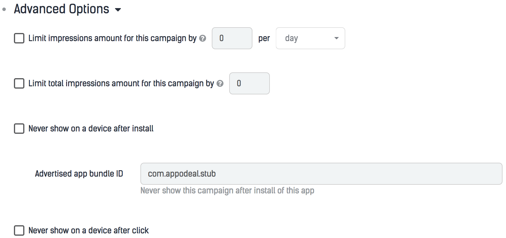 The main difference of the limitation from this block is that you limit the whole amount of impressions for a campaign and not for the unique device. You also can forbid campaign showing on a device after a click or install by selecting each checkbox. To make "Never show on a device after install" work you have to input bundle ID of the app you promote into the field "Advertised app bundle ID". After this configuration, installations tracking will start working (both of your apps should have Appodeal’s SDK integrated). Both of the "Never show ..." options work only from SDK versions 2.0.0.