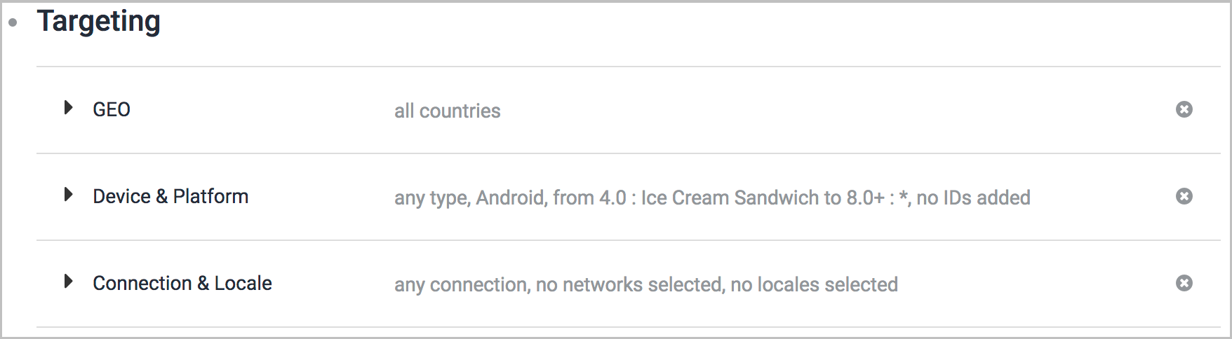 Targeting options consist of 4 types: GEO, Device & Platforms, and Connection & Locale.