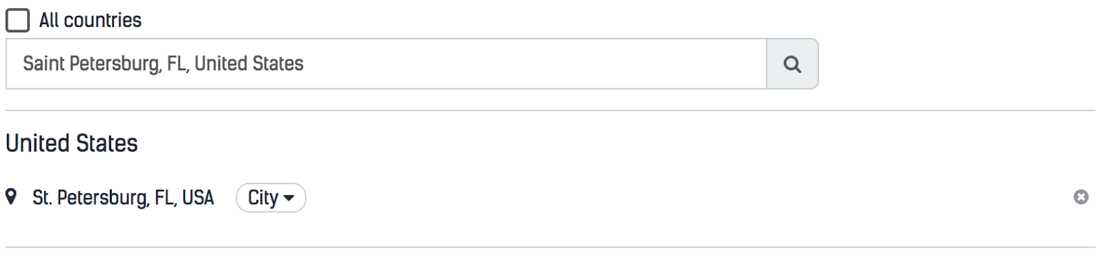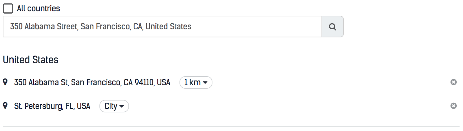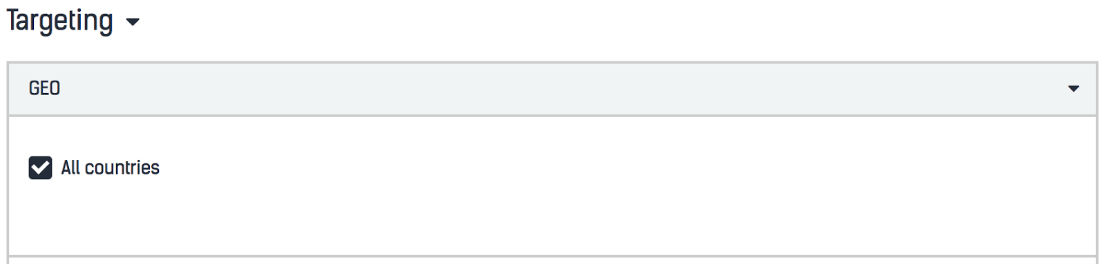 We should mention that geo-targeting may not be 100% accurate because not all devices send the exact coordinates. If the app doesn't collect device coordinates, the GeoIP will be used for targeting instead. By default,your campaign is targeted to all countries: