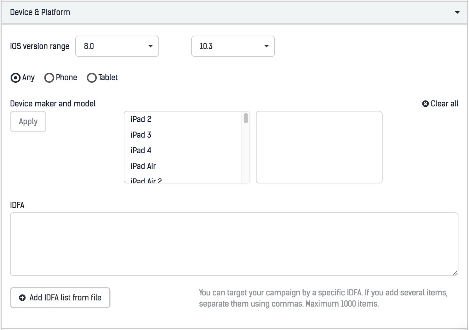 - targeting by certain IDFA/Advertising IDs (You can target your campaign to a specific IDFA. If you add several items, separate them using commas. Maximum 1000 items).