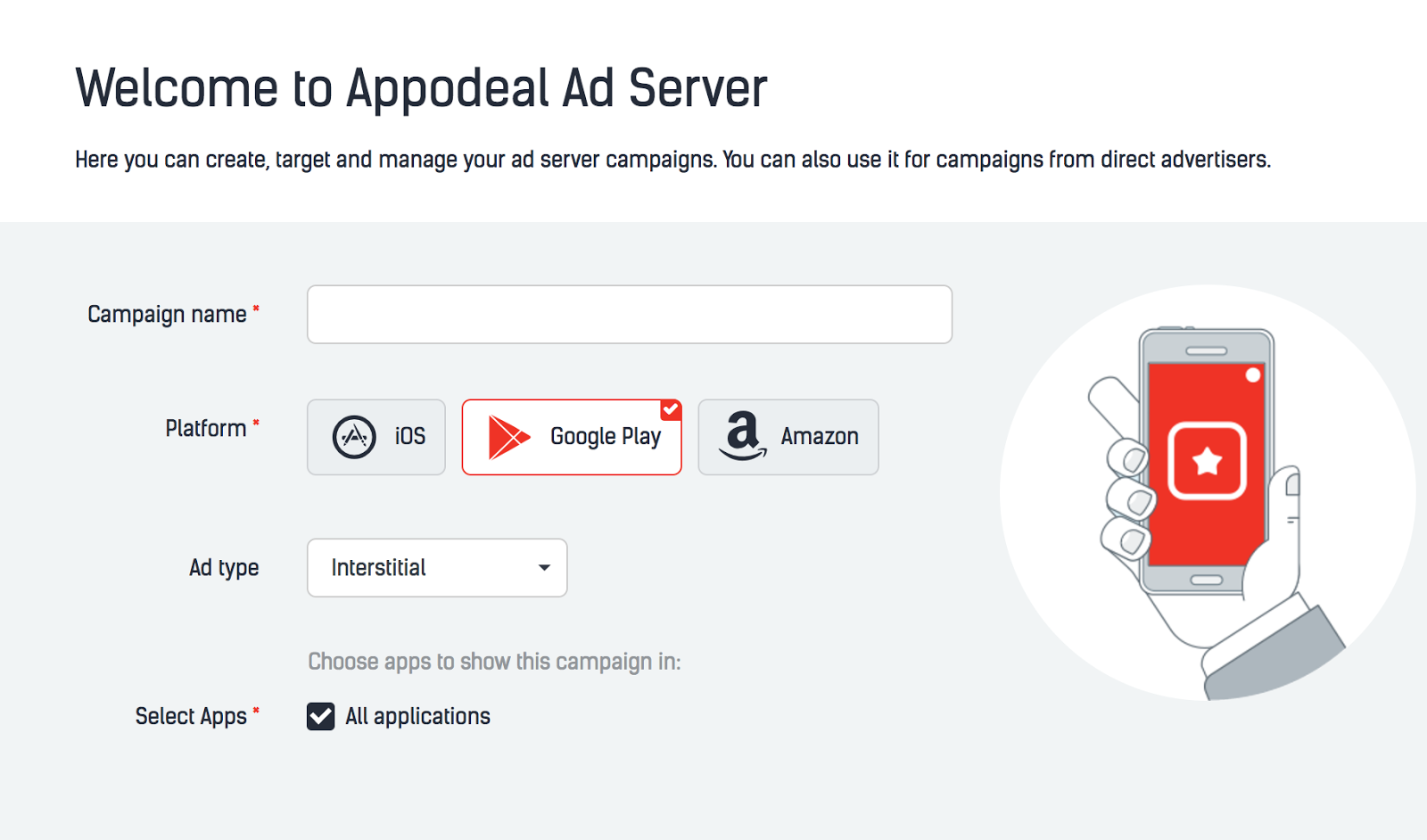 Ad Server allows you to cross-promote your apps or launch ad campaigns for direct advertisers who are paying you. It supports different types of creatives to use: Banners, Static Interstitials, MREC, Video, Rewarded Video and Native.