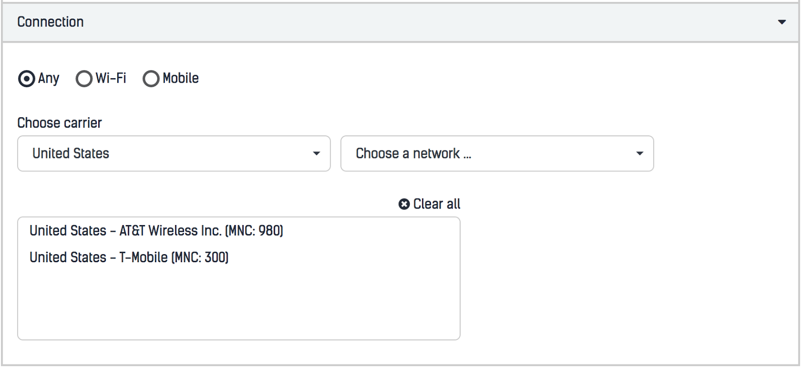 This block provides you options to filter devices by their connection type (Wi-Fi, Mobile or both of them) and choose several mobile networks from our lists: