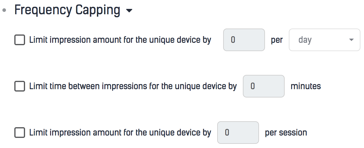 Frequency Capping provides you with a limitation of impressions amount for each unique device (By default there is no limitation):
