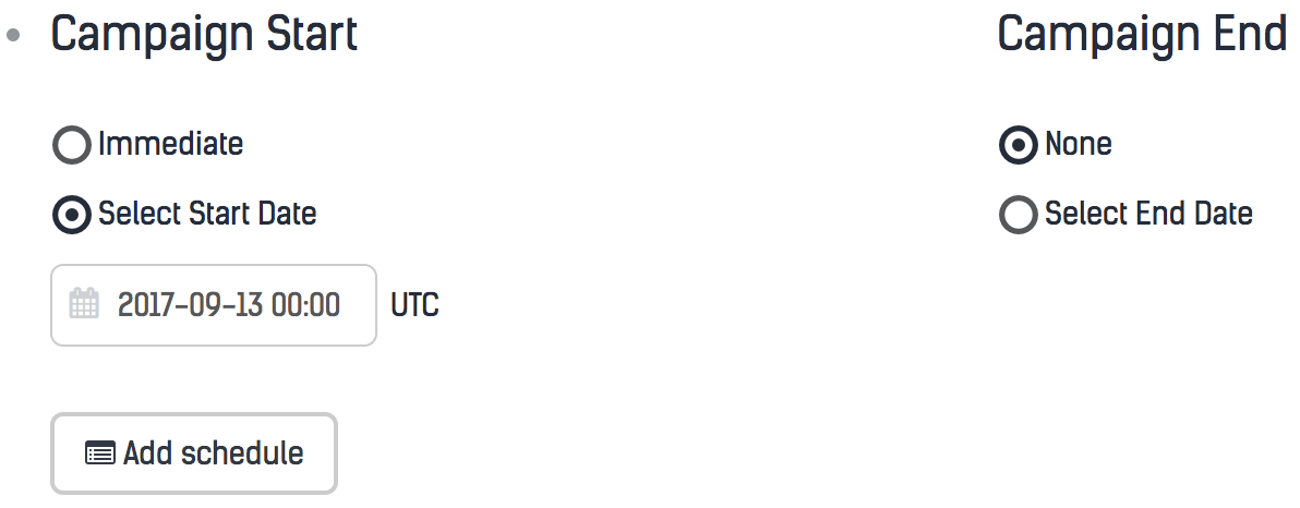 By default, the schedule is hidden and the campaign start/end are "Immediate" and "None". This means that after you turn on your campaign, it’ll start working immediately and it’ll only stop when you turn it off manually. If you want to change it, you can set start and stop dates: