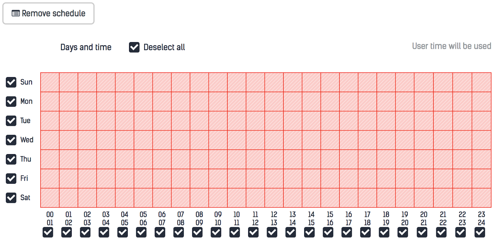 The schedule provides you with the option to make your campaign live only during selected hours and days of the week. Hour and day of the week are based on the user's device.