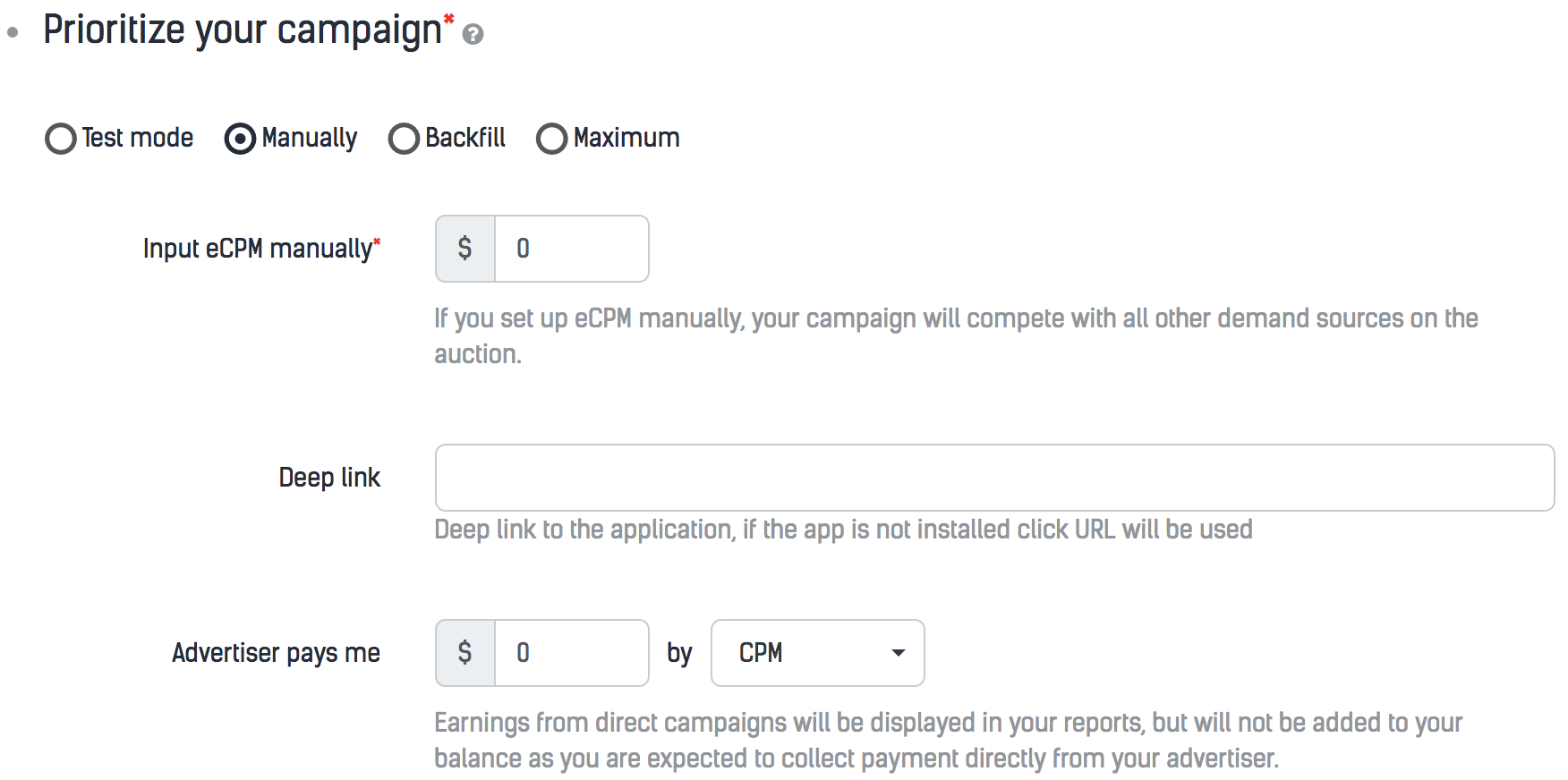 - "Input eCPM manually" is the eCPM of your campaign. With this eCPM, your campaign will be entered into the waterfall (this option is required).