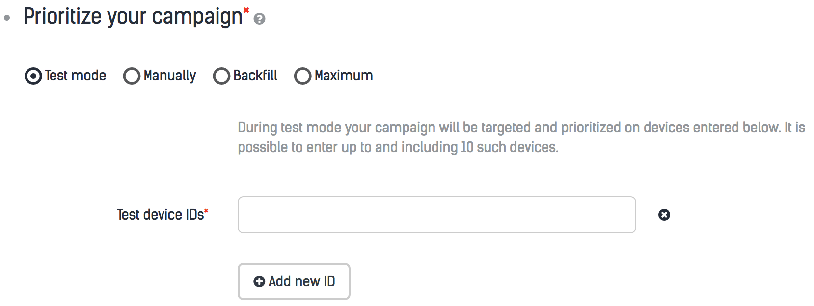 The last option is "Test Mode". Campaigns in "Test Mode" are always shown on the top of the waterfall as they would have "Maximum" priority. But they are seen only on one or several devices which adid/idfa are set in the "Test device IDs" fields.