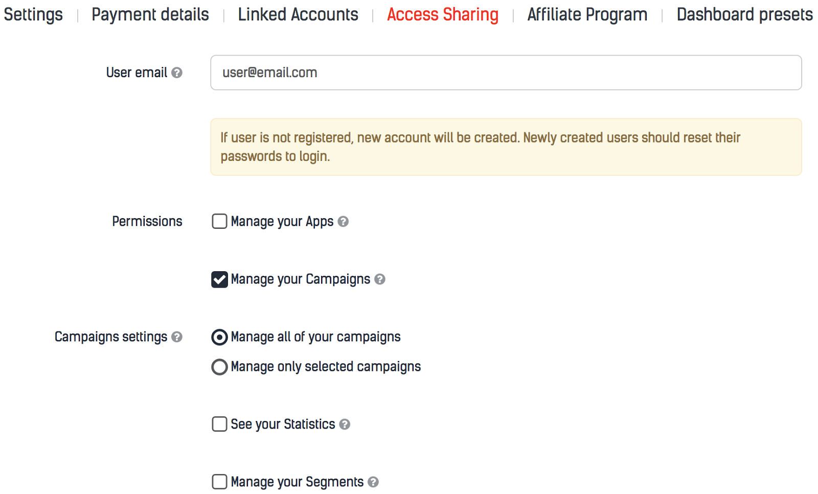 Also, you can share your campaign’s creation and editing rights with other users. To do this: