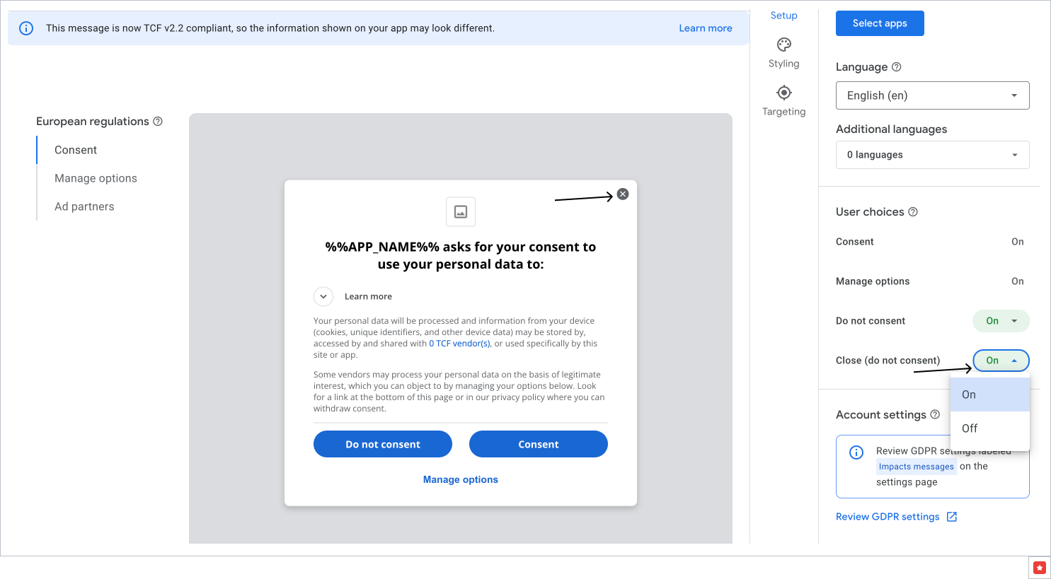 - (Optional) Enable the Close (do not consent) option to add a close icon to your message.