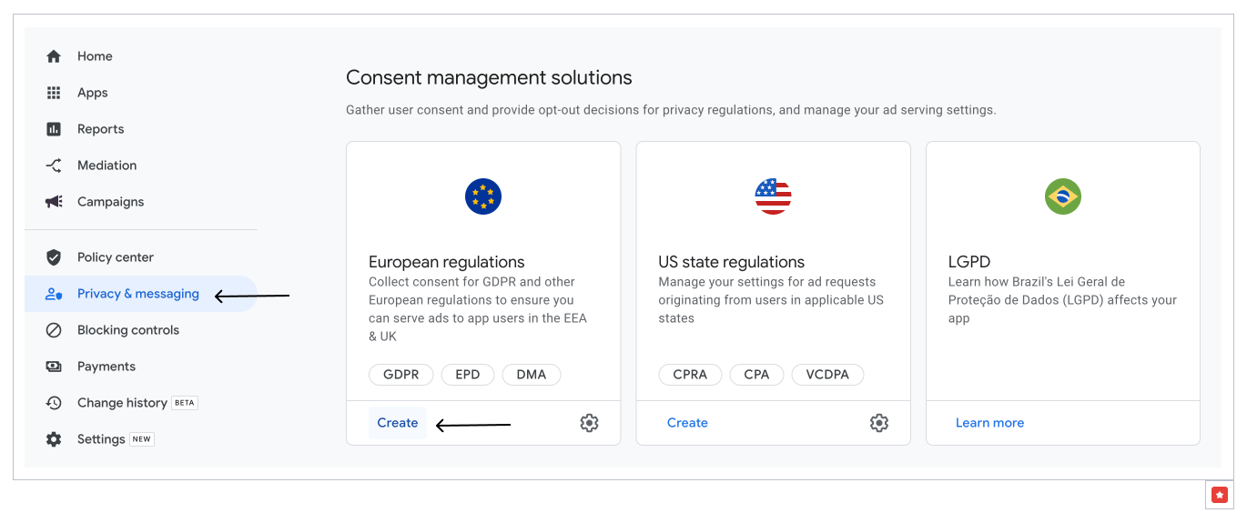 - Click Privacy & messaging → European regulations → and press Create.