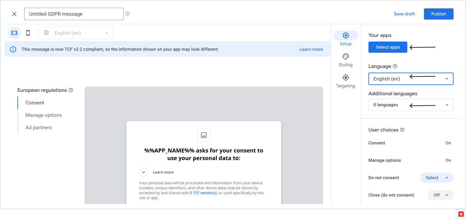 - In the User choices section, make a decision for the Do not consent option. If it is enabled, then this message provides your users with a choice to not consent to your ad partners and your ad partners’ purposes with a single click on the first page of the message.