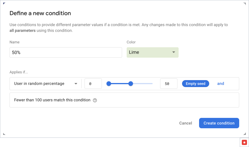 For the condition choose User in random percentage and select the value from 0 to 50.