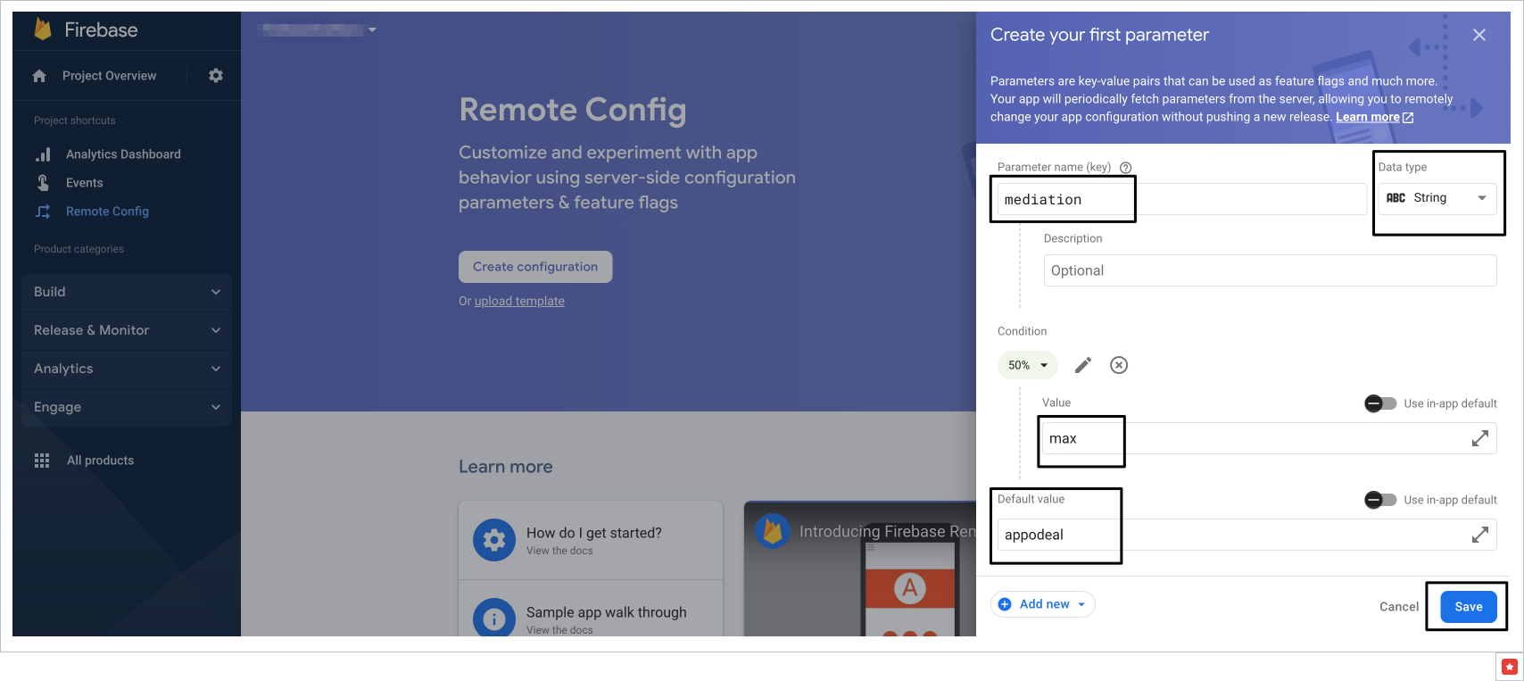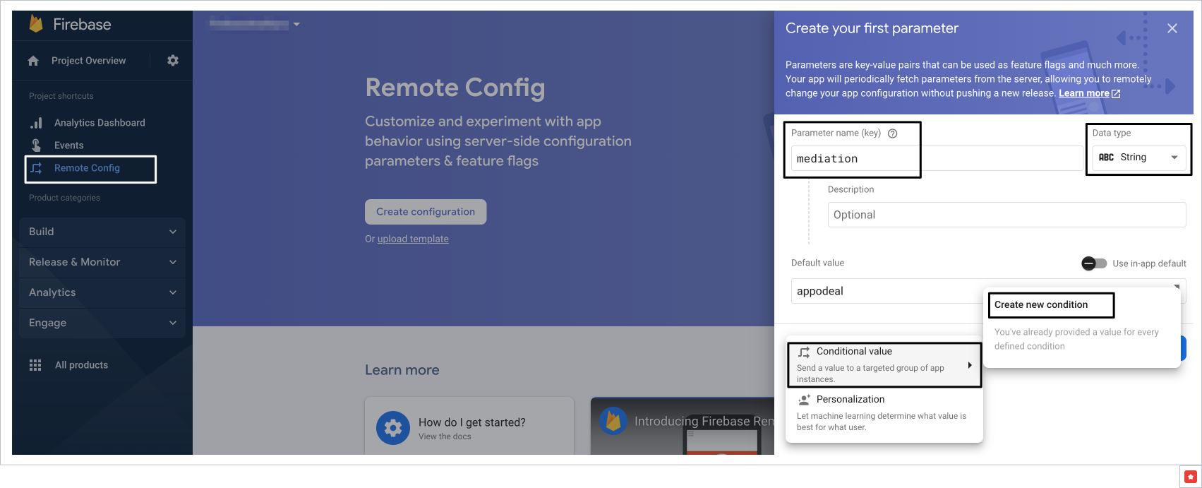 Go to Firebase Console -> select your project -> Remote Config -> press Create configuration.