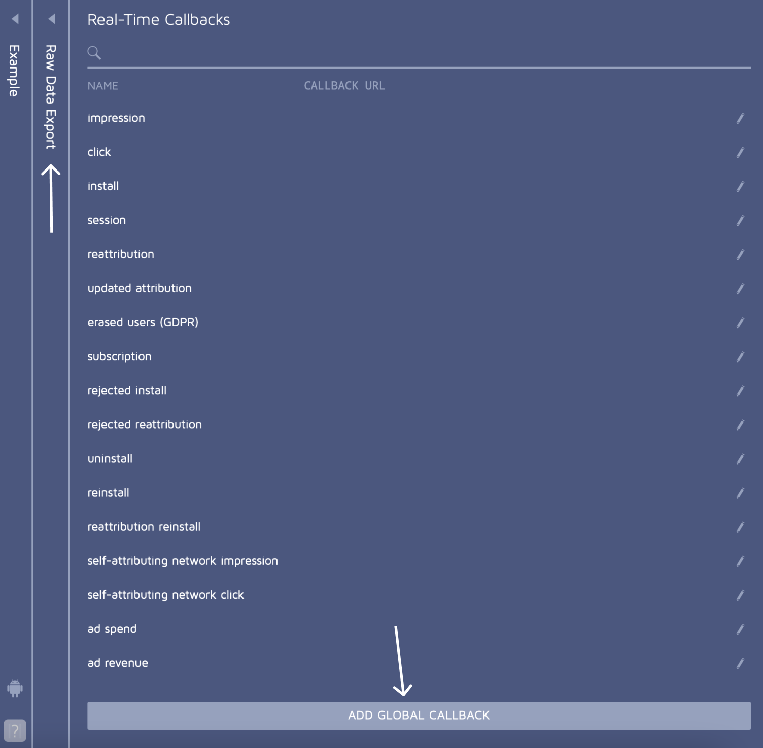 Go to your Adjust account app settings → Raw Data Export → Real-Time Callbacks → Add Global Callback (the one copied in Step 4)