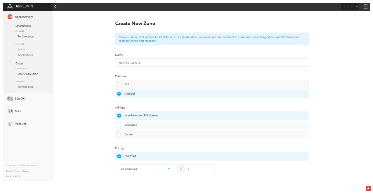 Default eCPM should be set to the same value as on in the AppLovin account when creating a zone. If a zone has Optimized by AppLovin pricing setting, set Default eCPM to 0.