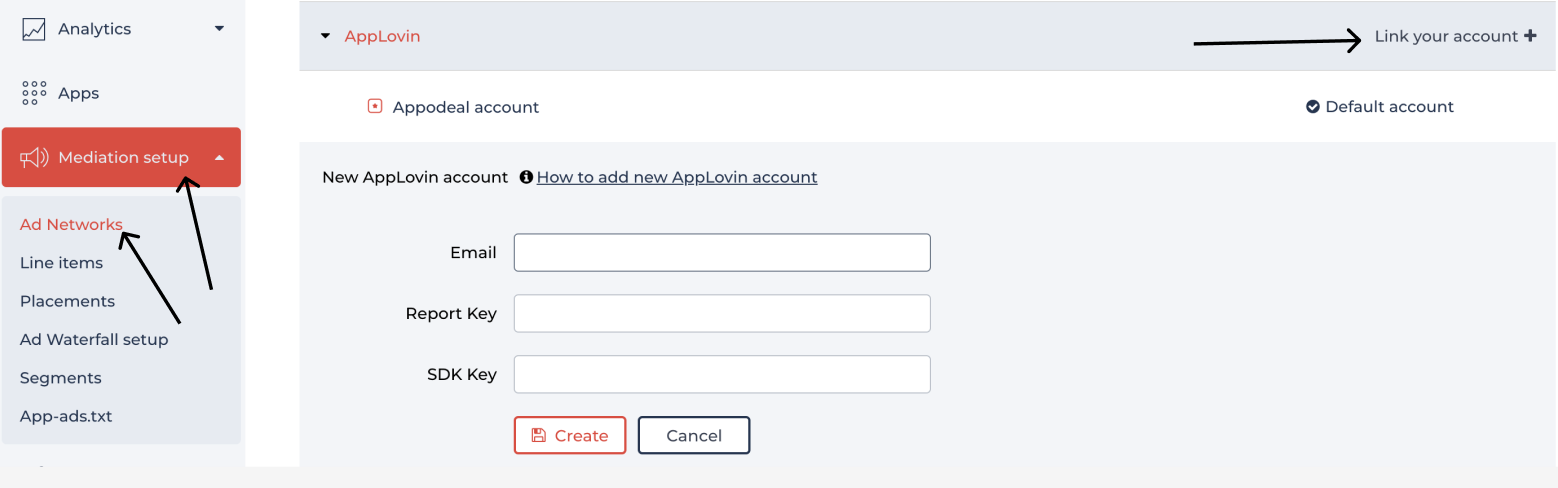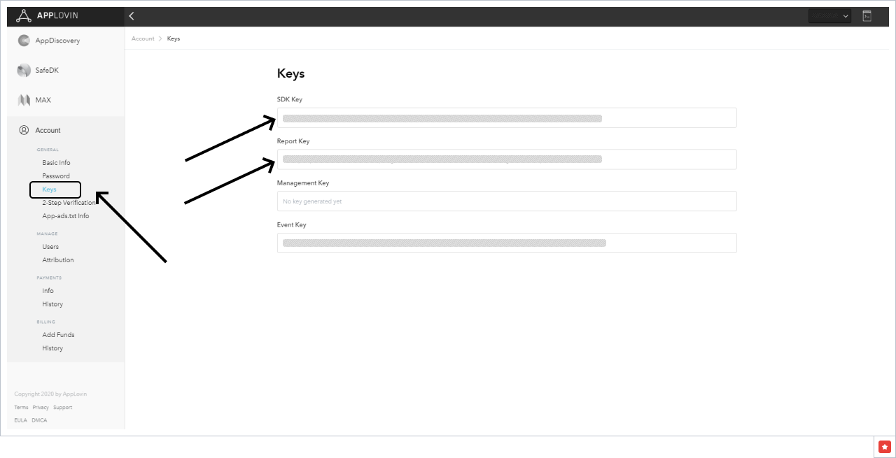 SDK Key and Report Key - to find it, log in to the Applovin account and click on Account in the lower-left corner and go to the Keys tab. SDK Key and Report Key can be found in the first two fields.