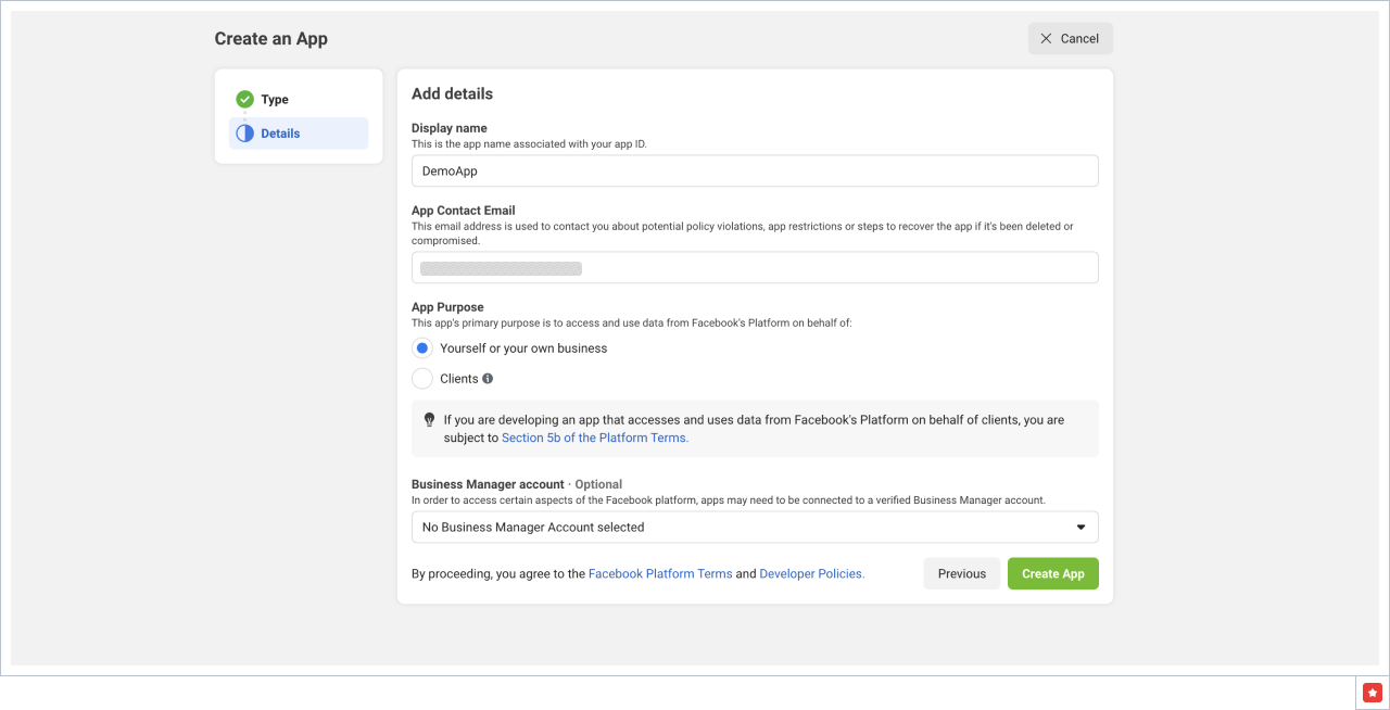 Fill in your personal information and create a Meta account. After this, you can log in and continue linking your Meta account to Appodeal.