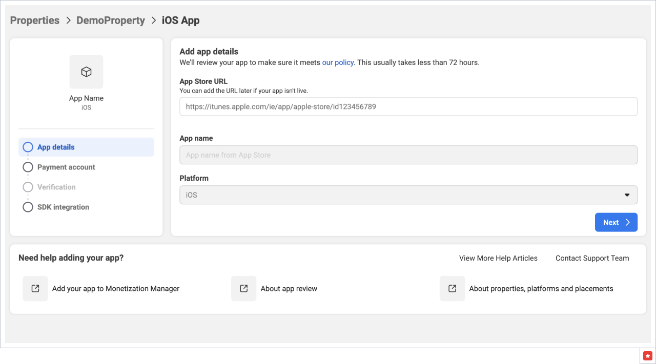 1. Add app details. If your app is already published, specify a link to the store. You can add the URL later if your app isn't live.