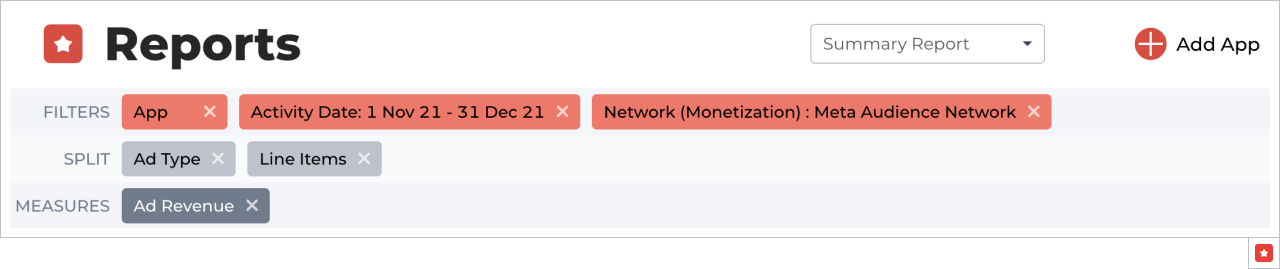 2. Create a report with filters App, Ad Network (select Meta Audience Network), split by Line Items and Ad Type. Add Ad Revenue measure.