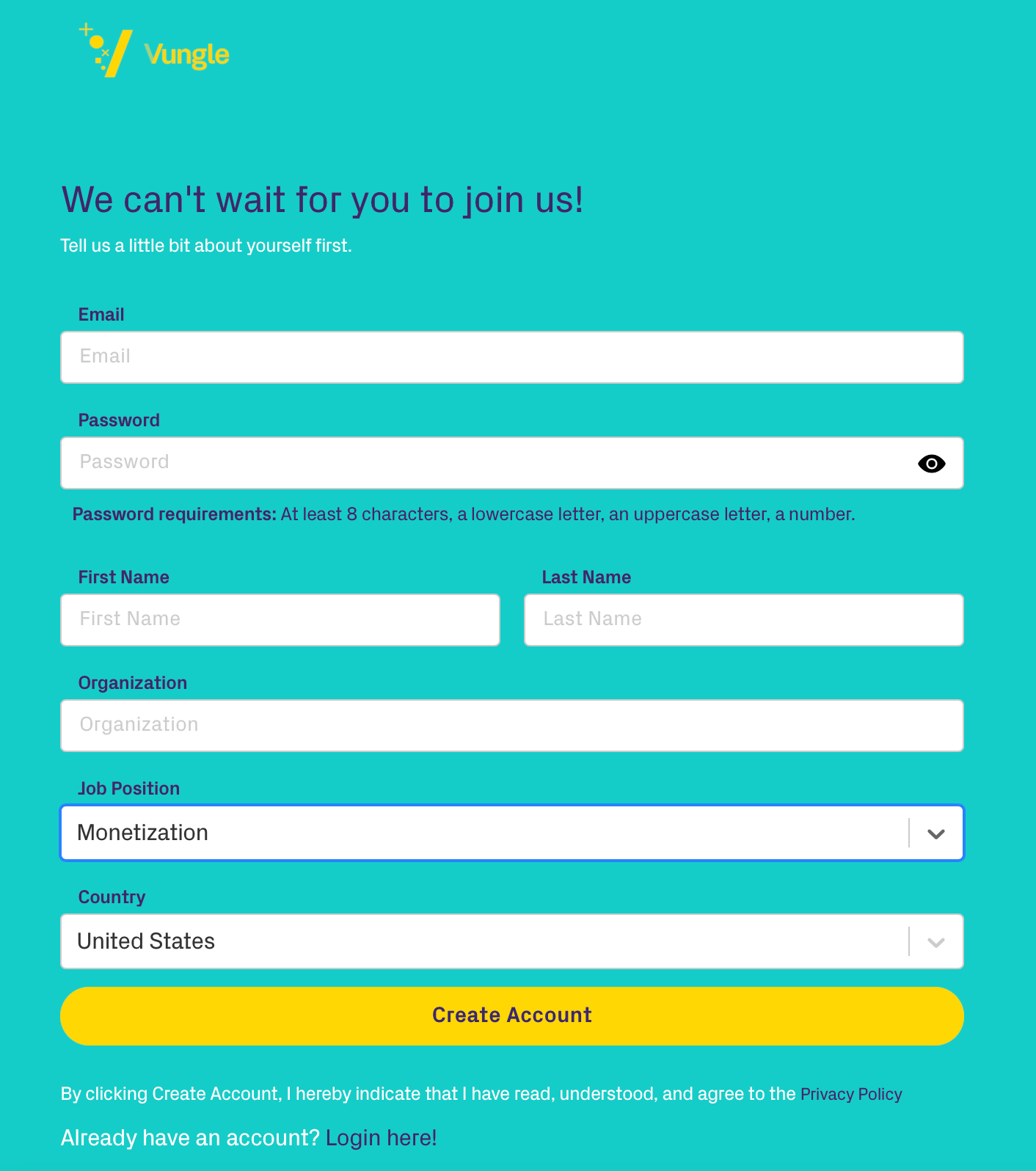 Create a Vungle account using this link. Choose Monetization as a Job Position.