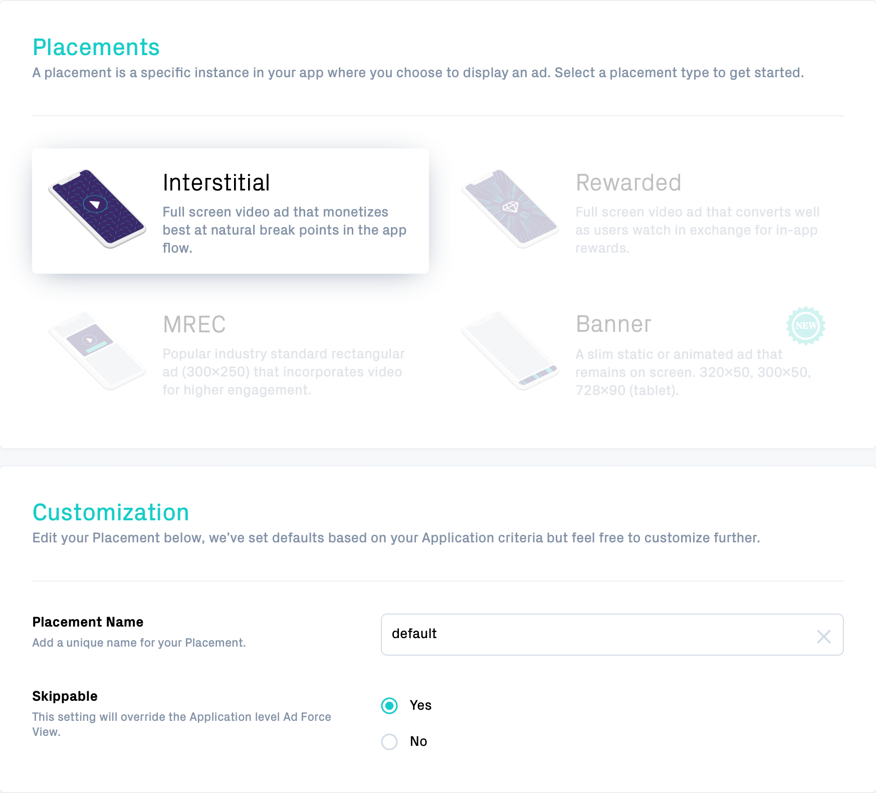 Select the ad type and fill the name of the placement. For rewarded video, choose "No" for a Skippable setting.
