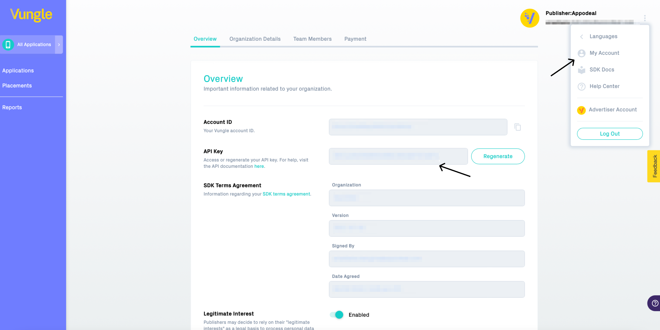 In order to get API Key from your Vungle account, click on the Settings button at the top-right corner, choose My Account and copy API Key: