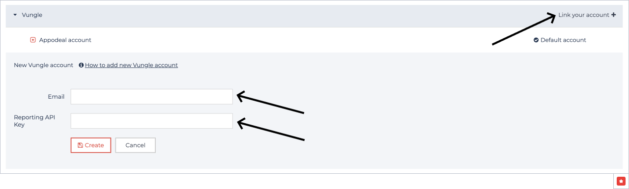 Now you can add an email for the Vungle account and Reporting API Key for Appodeal.