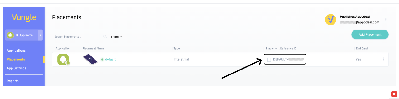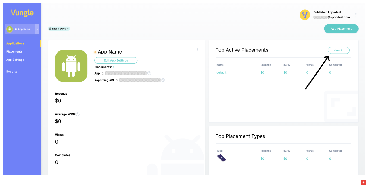 Go to the App’s settings on the Vungle side and click on View All for placements (see the screenshot below).