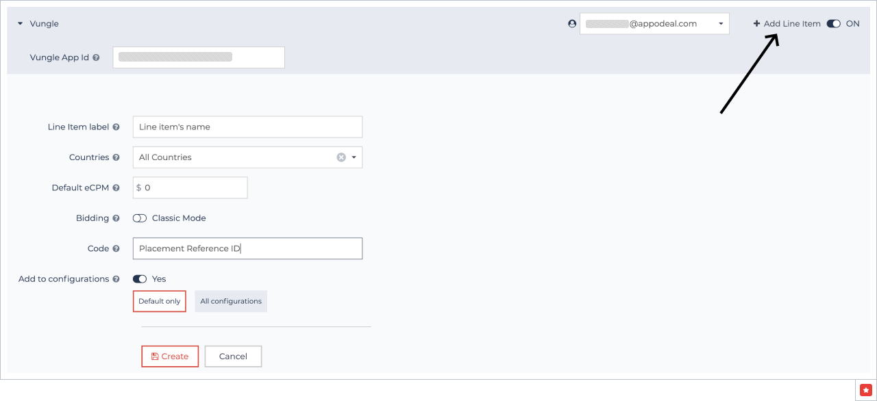 Add Vungle App ID on Appodeal side. Go to Line Items in the app's settings and select the ad type. Choose your Vungle account and add the Vungle App Id.
