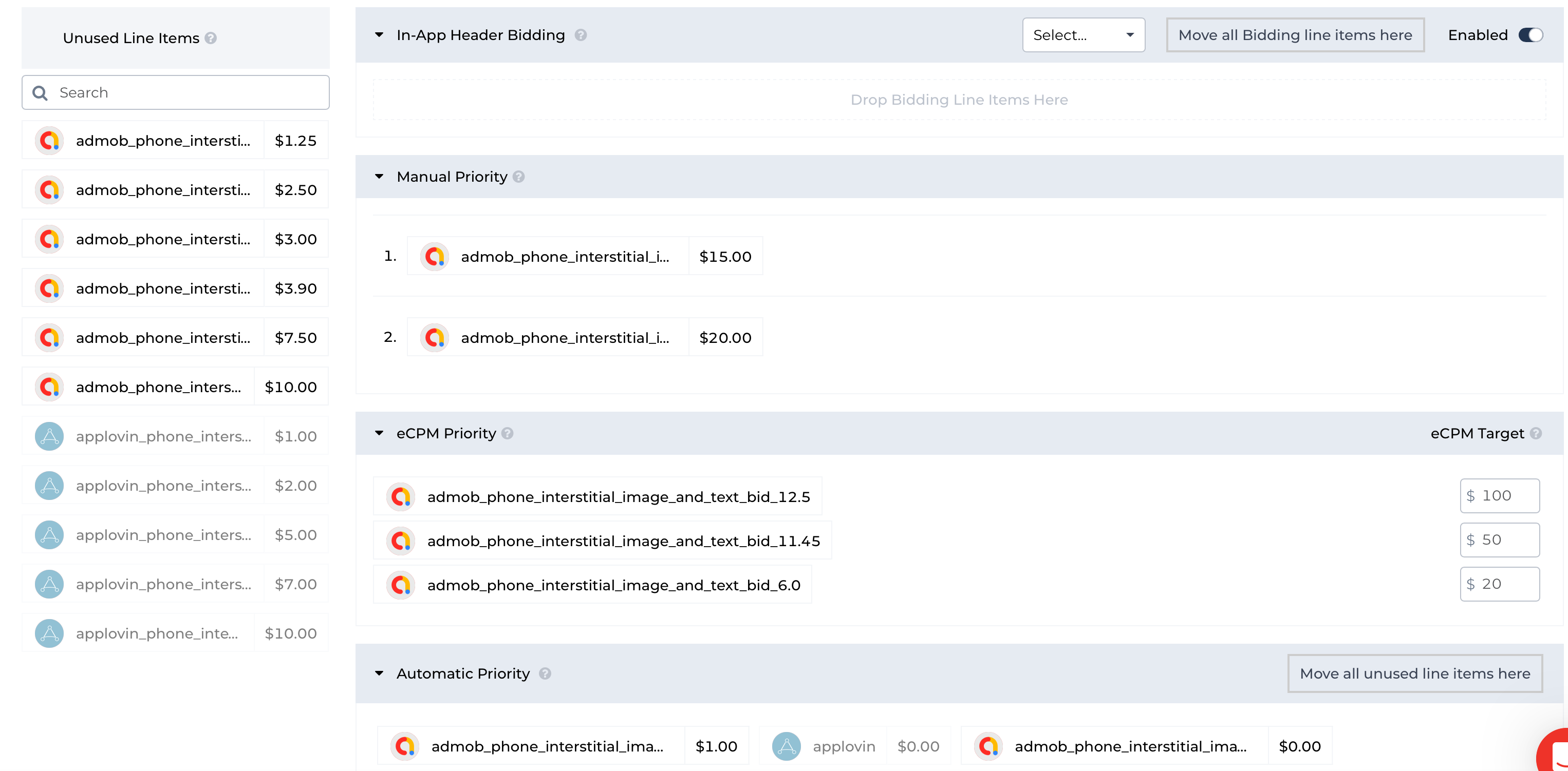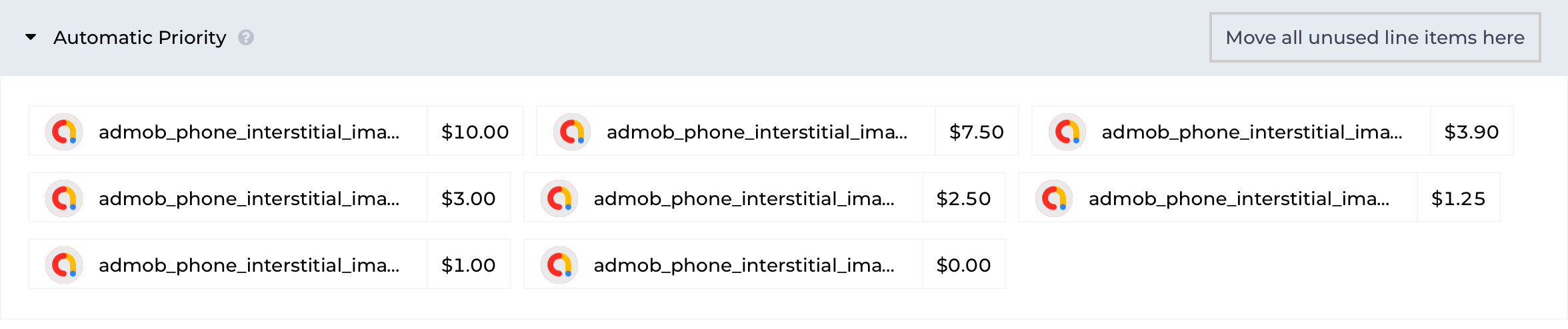 In most cases, it's recommended to add Ad Units to the Automatic Priority, where they are positioned automatically (based on the statistics at our disposal). You can also use the “Move all unused line items here” button to move all the ad units from the Unused Ad Units section to the Automatic Priority. Note that Ad Units in this section are sorted by their names.