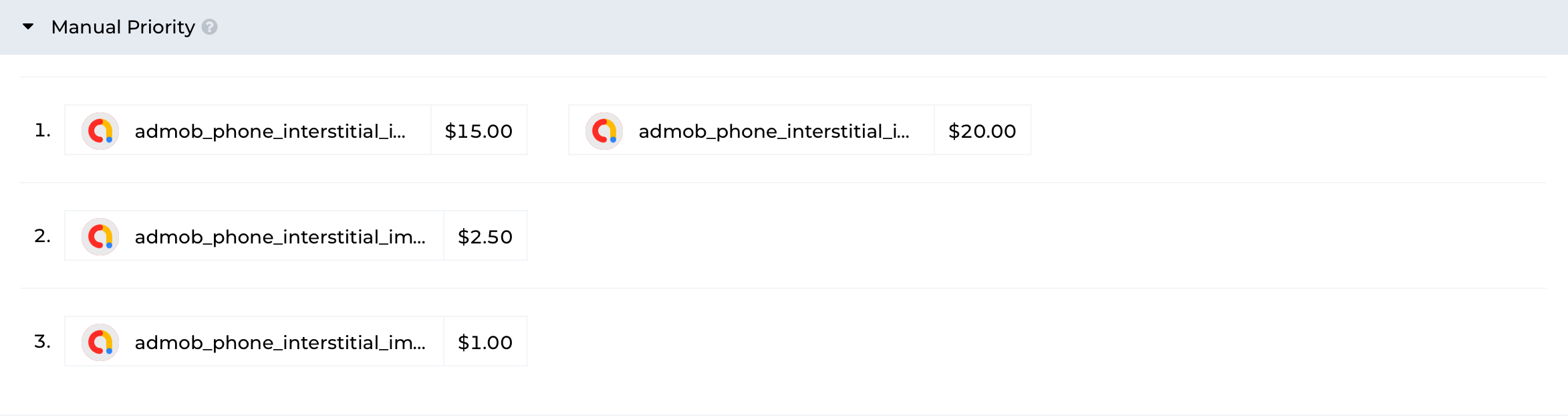 eCPM priority is in-between Automatic and Manual priorities and allows specifying eCPM for each Ad Unit for further automatic positioning.