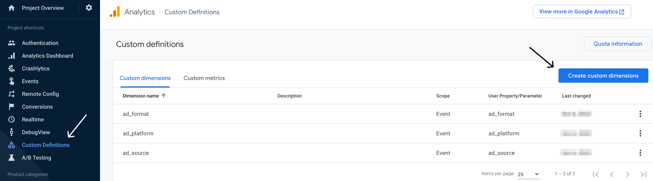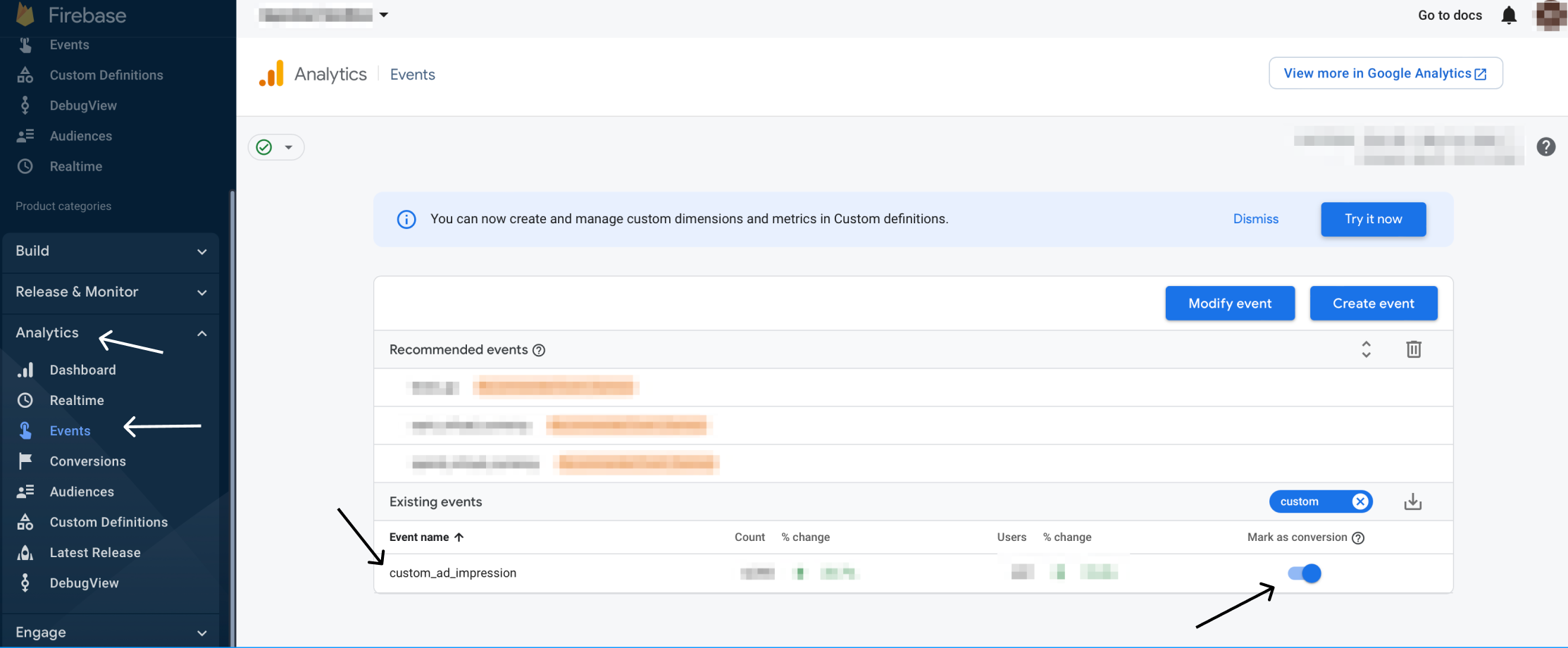 В Google Analytics ваши самые важные события называются конверсиями. Чтобы иметь возможность импортировать их на следующем этапе в свою учетную запись Google Adwords, вам нужно пометить событие custom_ad_impression как конверсию, перейдя в проект Firebase → Analytics → Events.