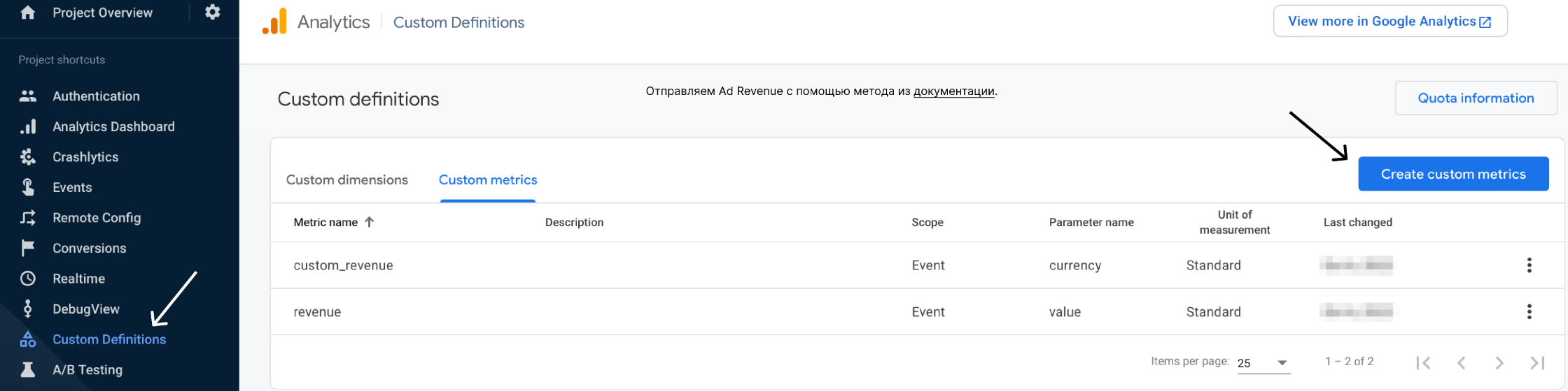 - Для более удобной навигации и просмотре параметров вашего события, выполните следующие шаги, но только после того, как увидите событие custom_ad_impression на стороне Firebase: