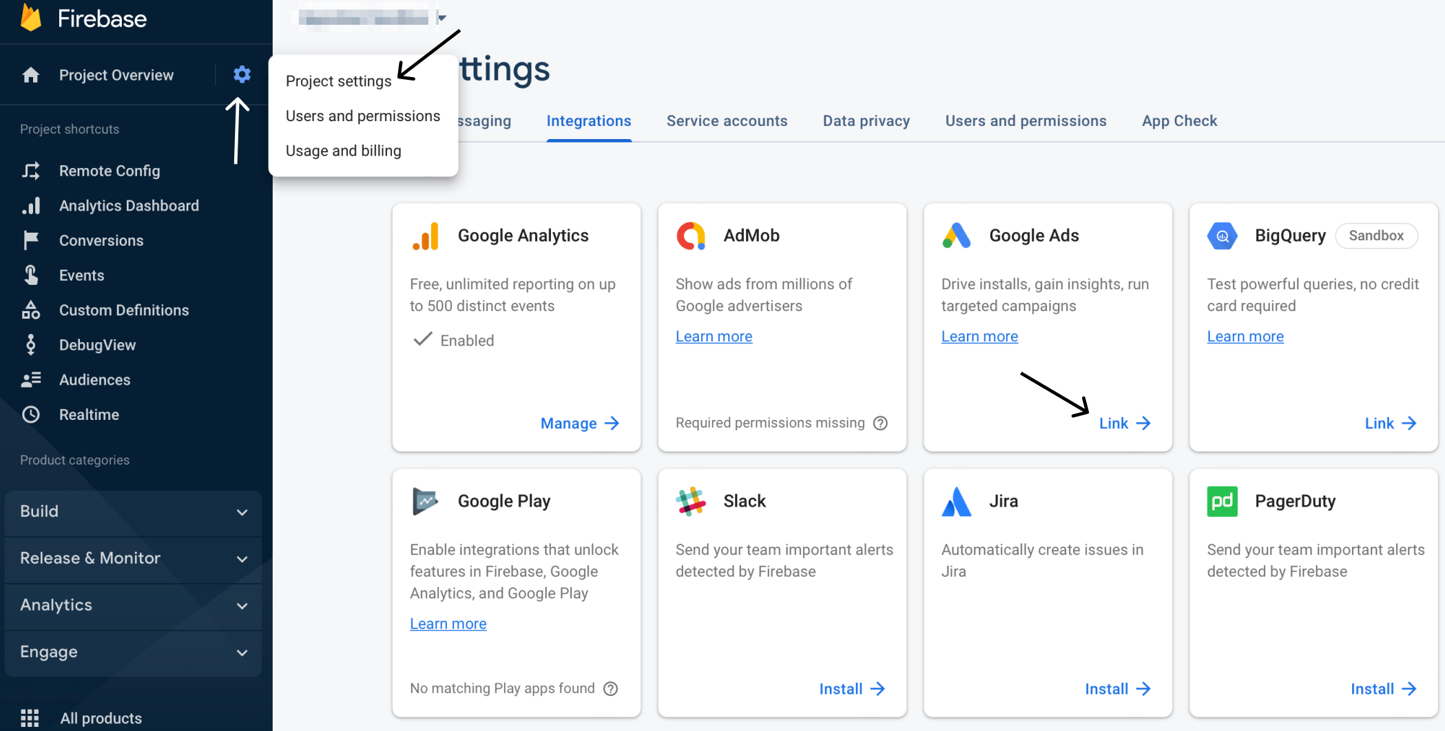 Для этого перейдите в свой проект Firebase → Project settings → Integrations → Google Ads → Link → Выберите свою учетную запись Google Ads.