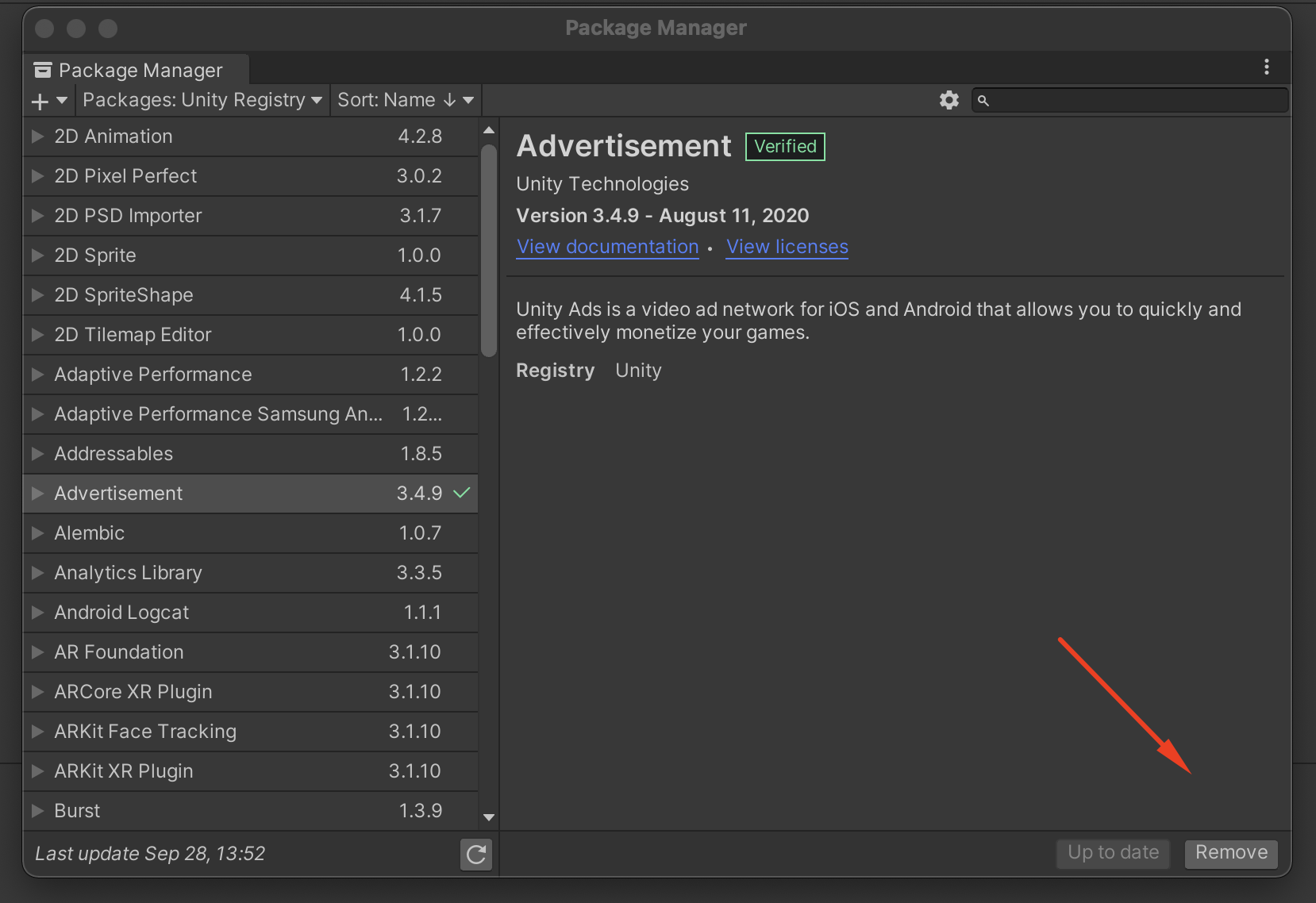 - Перейдите в Window → Package Manager и удалите пакет Advertisement.