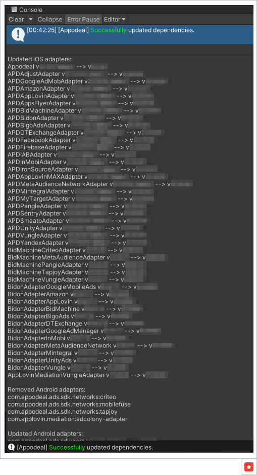 You will also be able to see the detailed logs in the console, which adapters were added, removed, updated or downgraded.