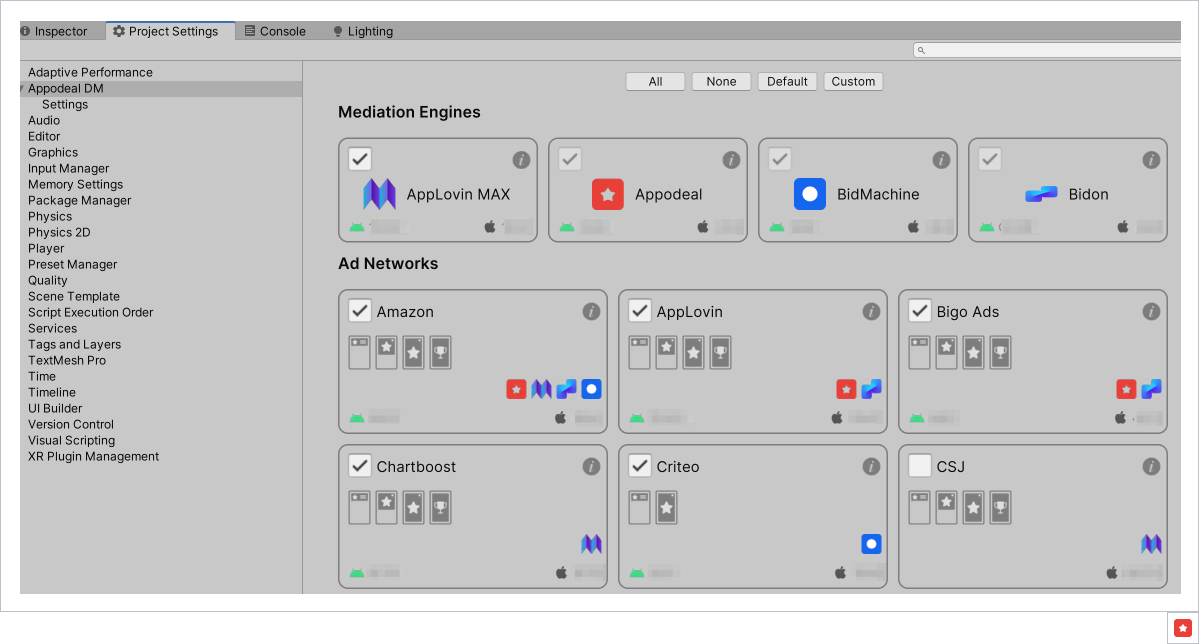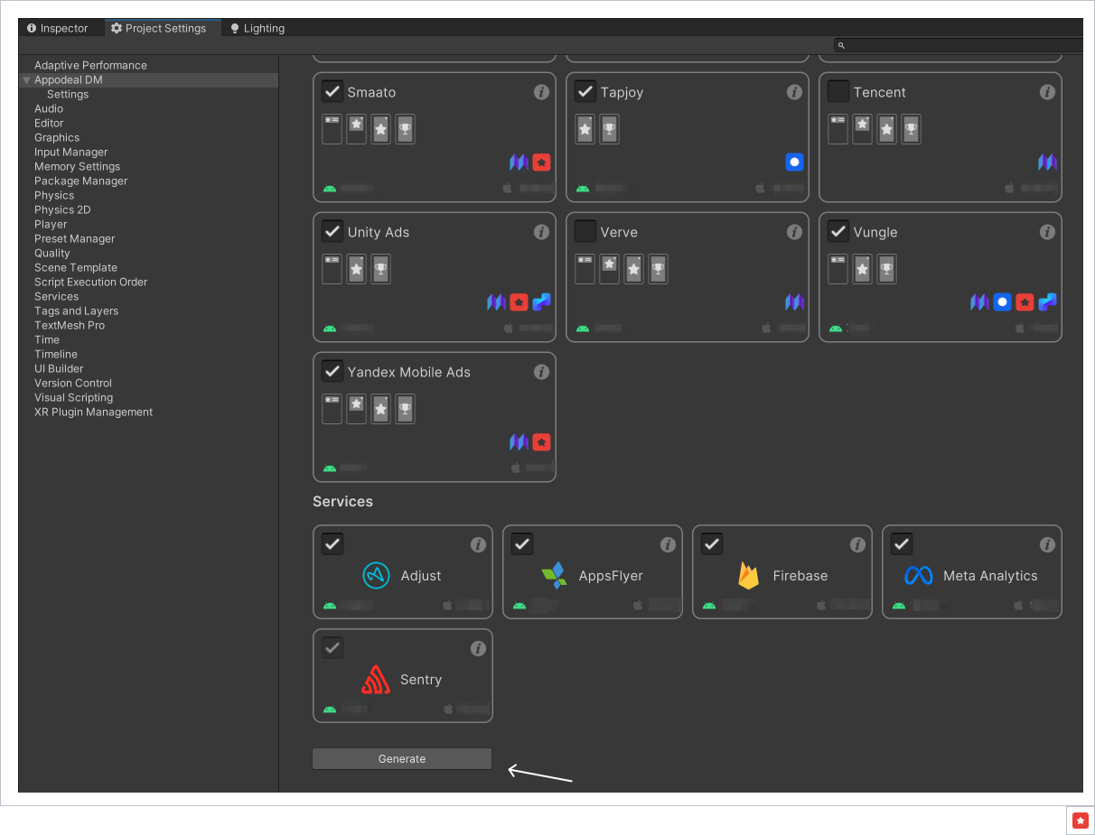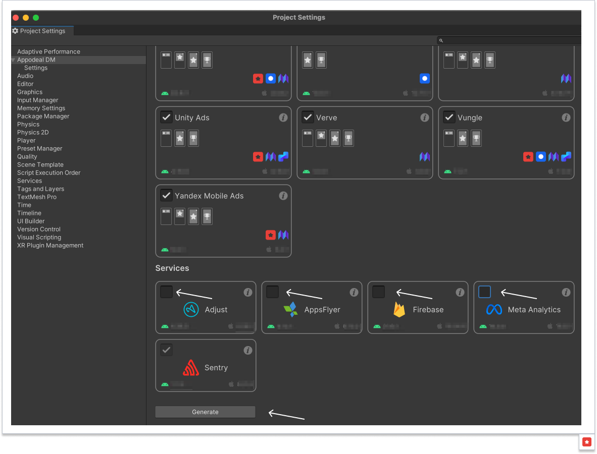 After adding the Appodeal package all the ad networks and services are added by default. You can use Appodeal DM to remove or import dependencies.