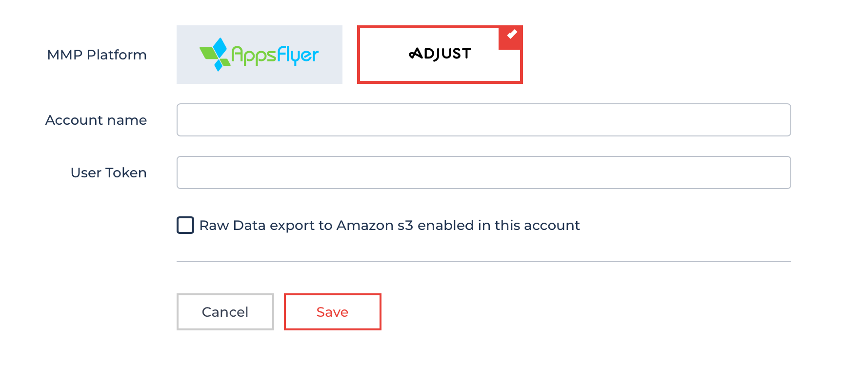 For Primary MMP Account choose your Adjust account, you can leave Secondary MMP Account empty, for Raw Data Source choose Amazon S3 Bucket (if you have one and if you have added it with your Adjust account) or choose Global Callback (enabled by default).